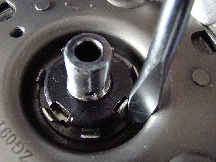 拆掉初级离合器盖;再拆初级离合器圆螺母和止退垫圈;用一字改锥撬开止退垫圈锁扣;如下图。