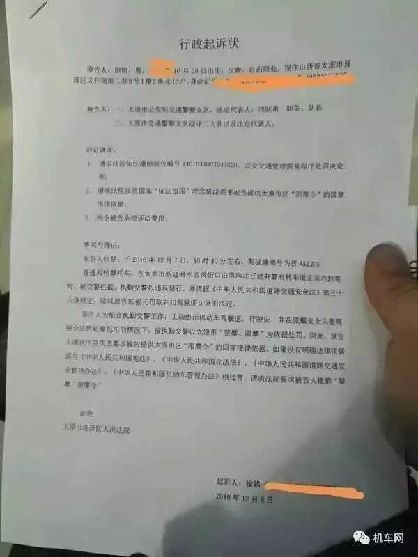 据搜狐等网站报道: 2016年12月7日16时,摩友“懐特森林”(真名:徐铭)驾驶两轮摩托车在太原市新建路水西关街口由南向北行驶并靠右转车道正常右转弯时,被交警拦截。执勤交警以违反禁行,并依据《中华人民共和国道路交通安全法》第三十八条规定,处以原告贰佰元罚款并扣驾驶证3分的决定。 徐铭提出太原市禁摩规定是2009年发布的,按照地方性法规的立法规定,该项法规的有效期为五年,也就是到2014年太原的“禁摩令”已经过期作废。在交警部门不予理睬的情况下,徐铭将交警队起诉至太原市晋源区法院。 (图片来自搜狐·机车网)
